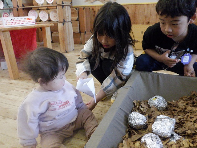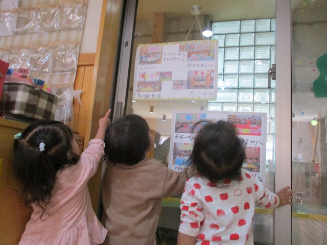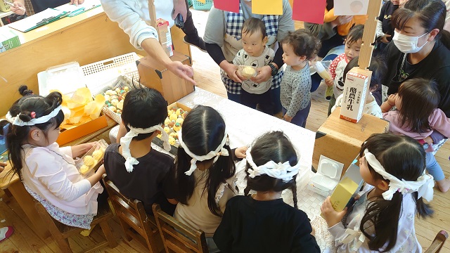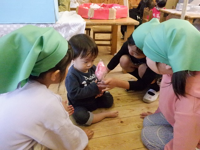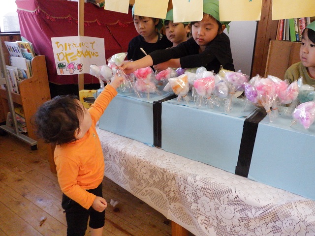 0歳児・・・もり組のお店屋さんに出かけました。つくし組の子どもたちにやさしく語りかけながら商品を渡してくれたもり組さん。にぎやかな雰囲気に最初はびっくりしていた子どもたちも最後は商品を握りしめて嬉しそうにしていました。