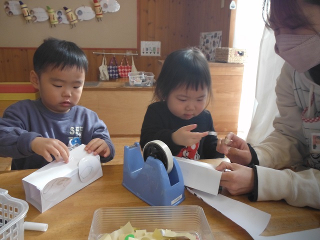 お店やさんになりきって、物と関わるコーナーで物作りを楽しんだり、作った物を持って宣伝に行くことを楽しんでいます。