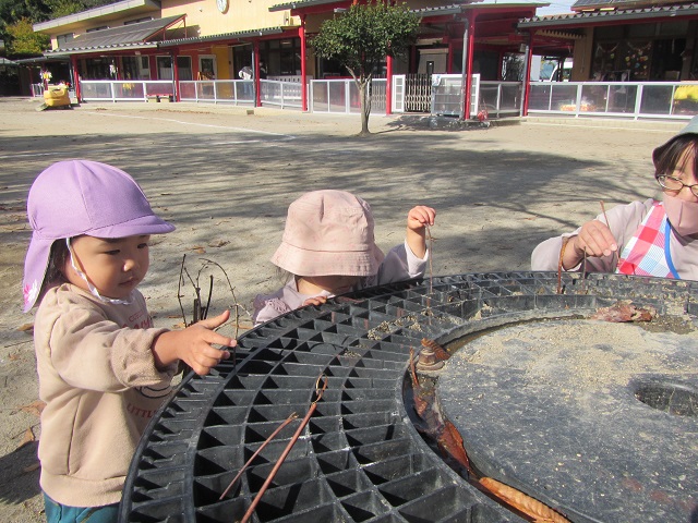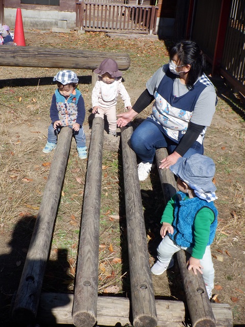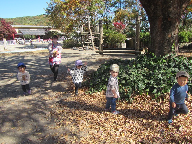 1歳児・・・園庭をかけまわったり、見つけたもの(木の枝や葉っぱなど)を拾って遊びにとりいれてみたりなど、思い思いに遊びを楽しんでいます。