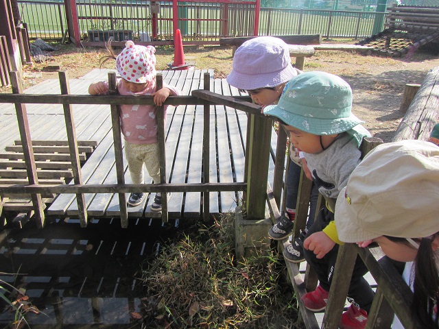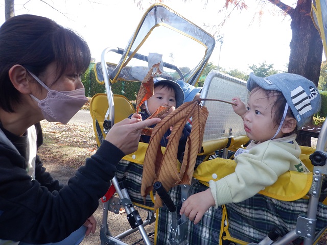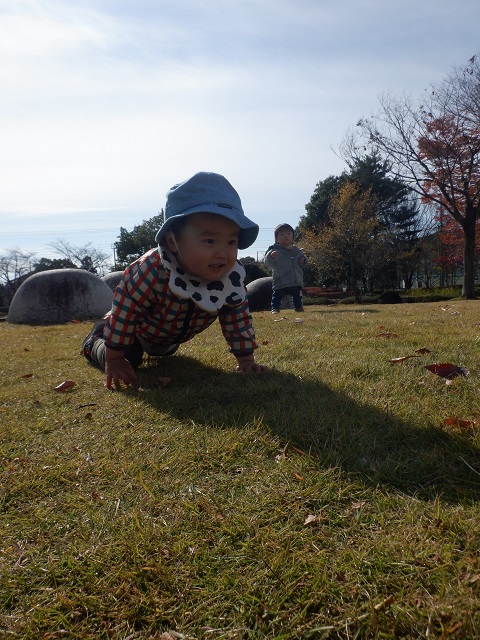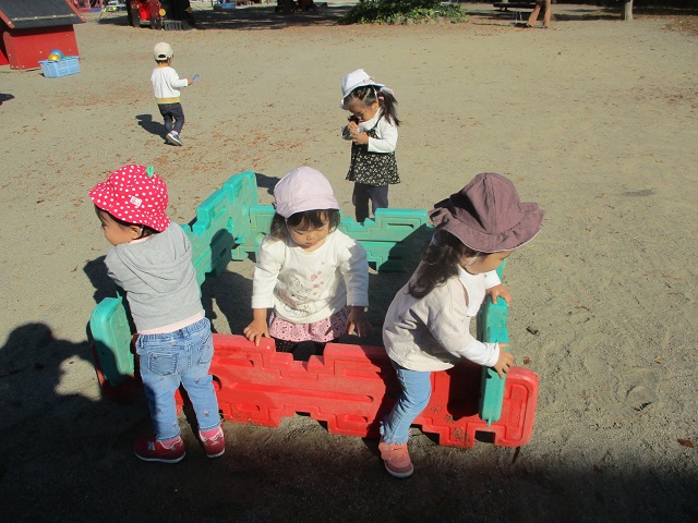 0歳児・・・園庭の遊具に登ってみたり、運動公園に散歩に出かけたりしました。さわやかな天気の中でのびのびと体を動かすことを楽しんでいます。