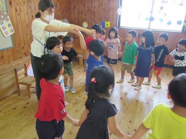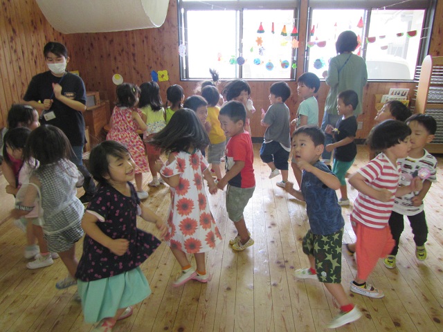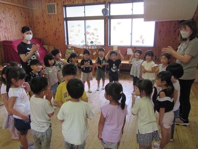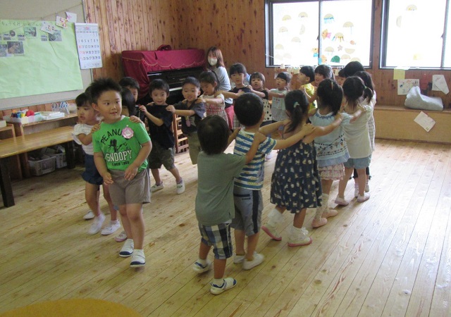 友達や保育者と一緒にノリを合わせる楽しさを感じています。