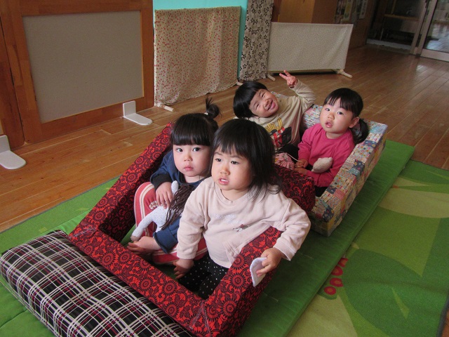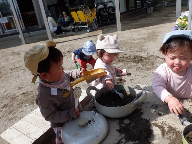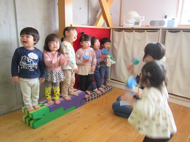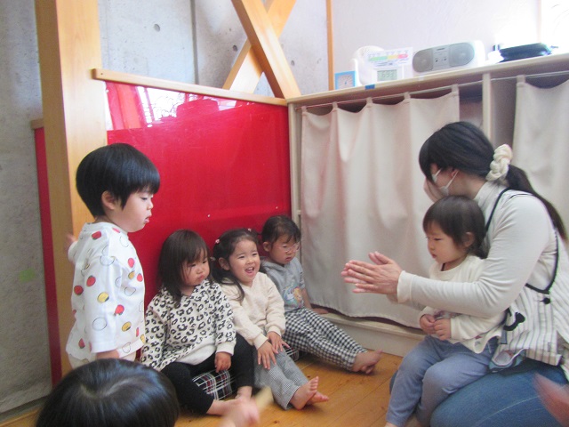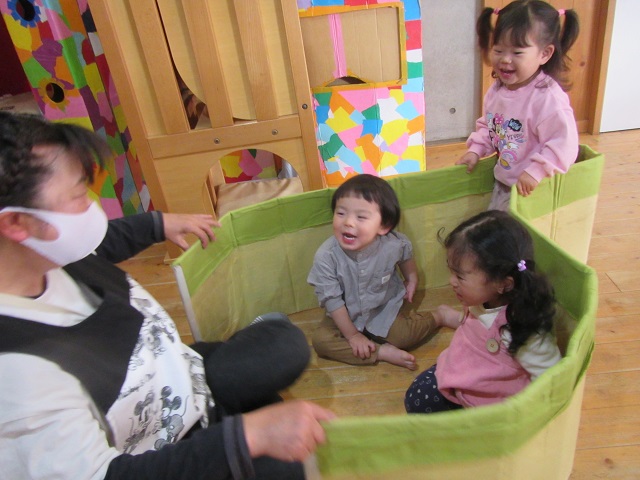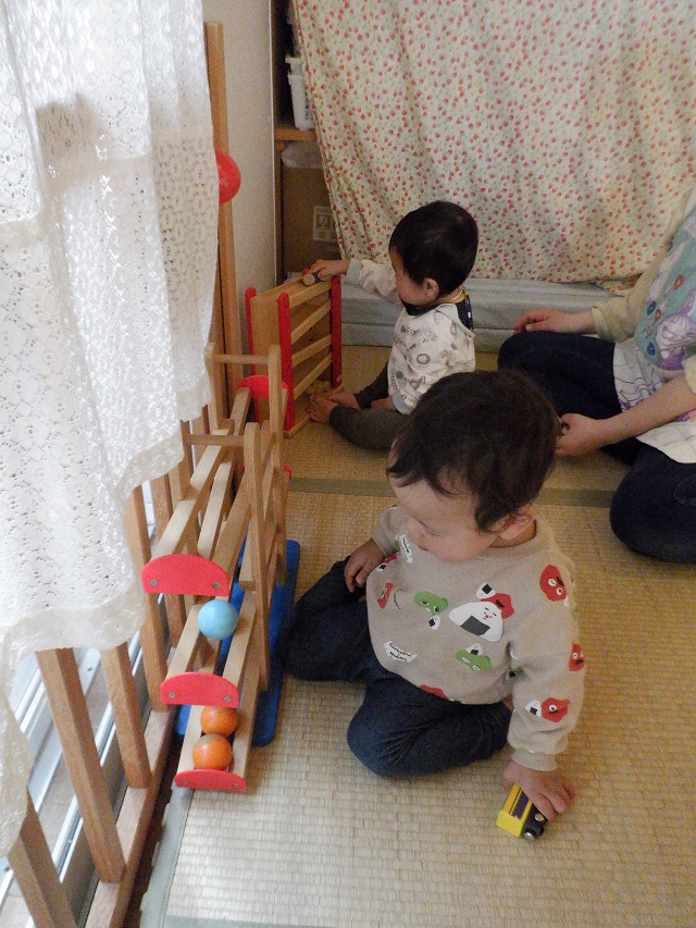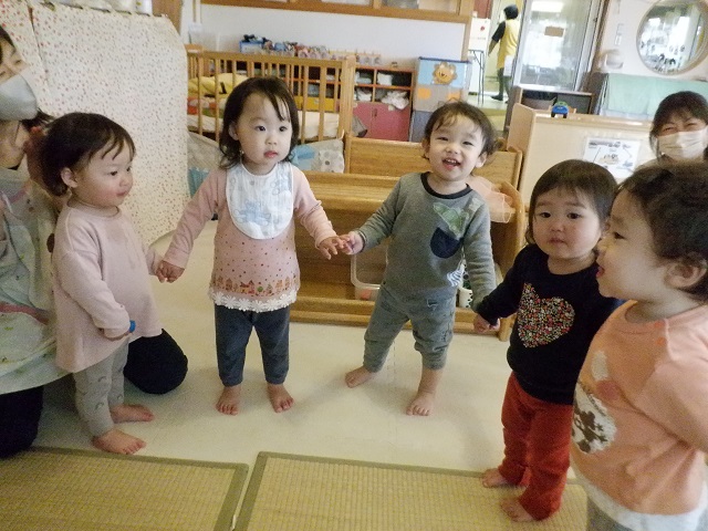0歳児・・・つくし組最後の週もたくさんの遊びを楽しみました。一緒に遊ぶ中で徐々に友達の存在にも気付き始めています。