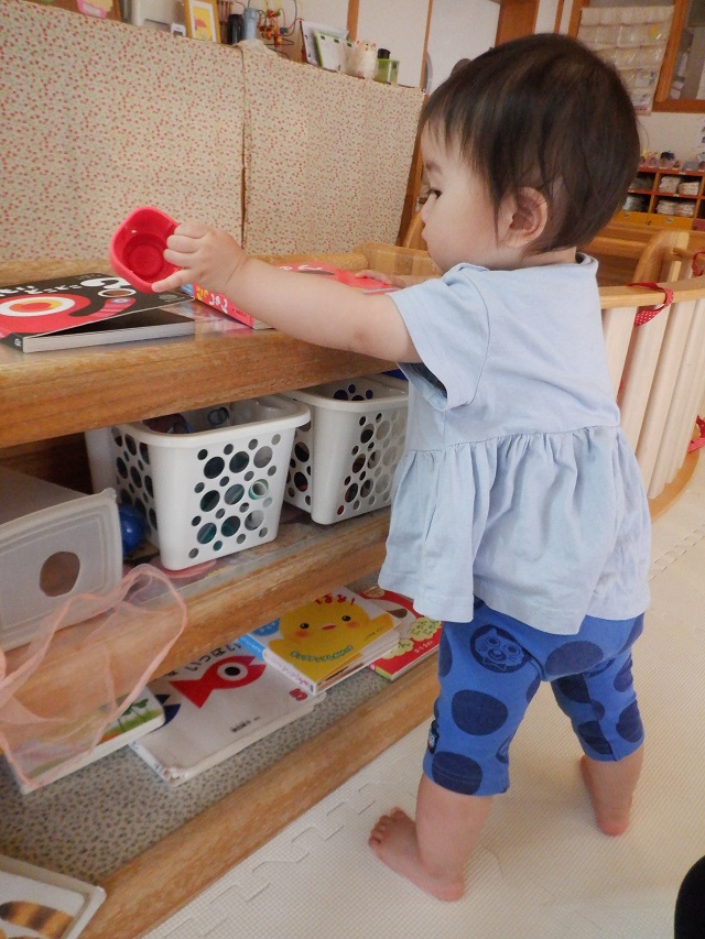 月齢の高い子たちが楽しんでいるかくれんぼごっこ。「みんな、みーつけた!」