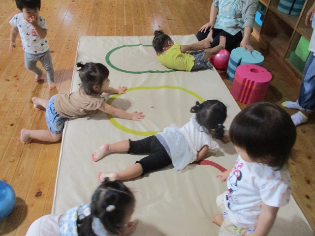 1歳児・・・ホールで、ウレタン積み木やマット等を使って体を動かすことを楽しんでいます♪