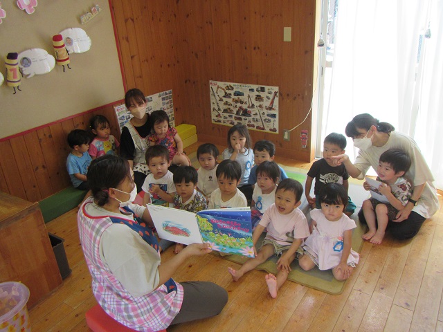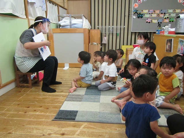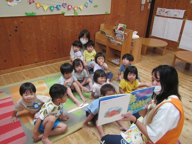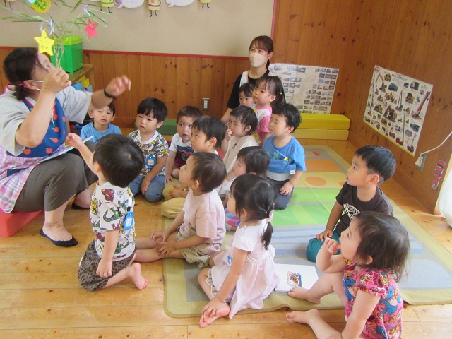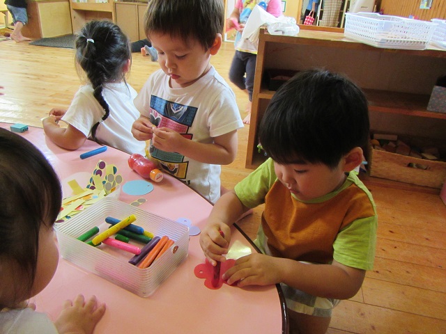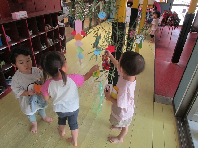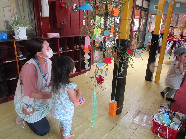 7/7は七夕ですね。子ども達と一緒にサインペンなどを使って、様々な形の画用紙に描いた物を、笹に飾るなどして七夕の雰囲気を楽しみました。クラスでは、七夕にまつわる絵本なども楽しみました。