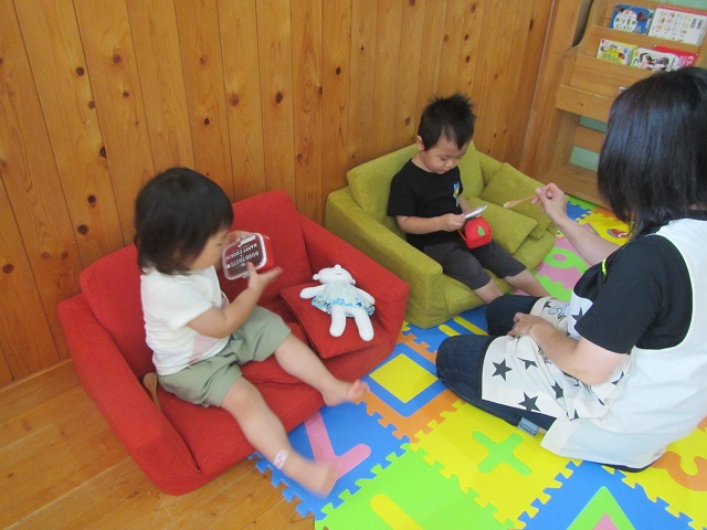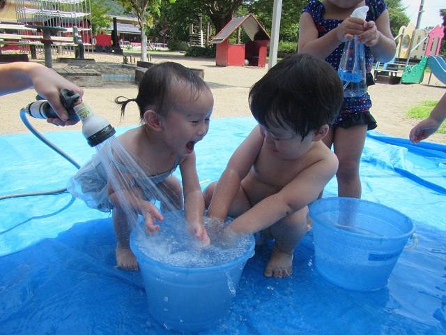 0歳児・・・暑い日が続いていますね。水遊びを楽しむ他にも仕掛けのある玩具で遊んだり、ひんやり冷たいウォーターマットに触れて感触を楽しんだりしています。