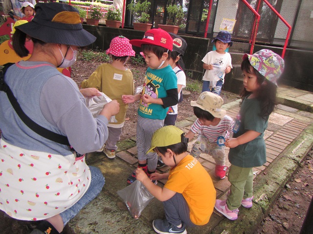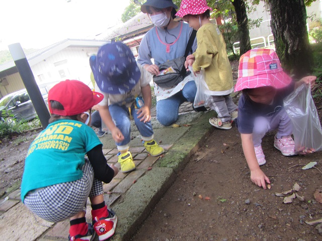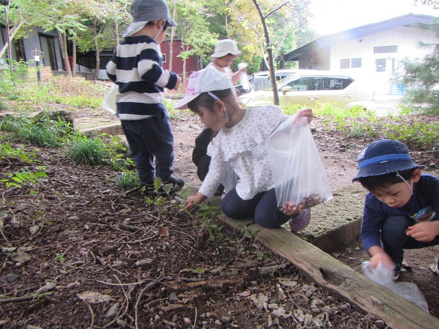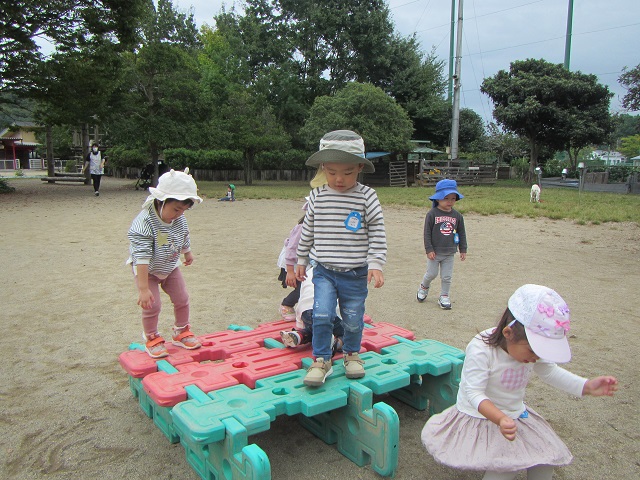 園の裏にある山やはらっぱに散歩に行き、ドングリやバッタなどの虫を見つけたり、様々な刺激を受けながら元気いっぱい体を動かすことを楽しんでいます。引き続きよーいどん!やマルチパネルの山を乗り換えるなどして楽しんでいます。