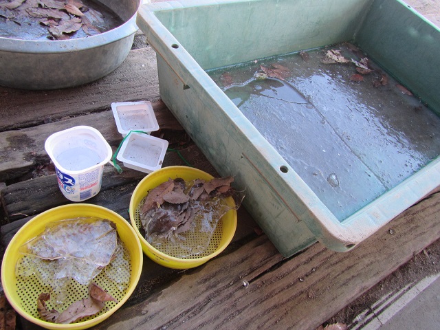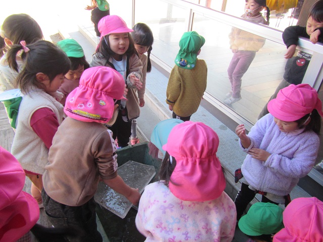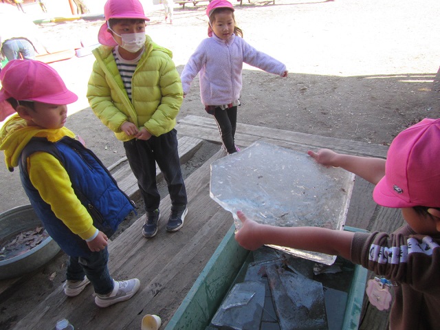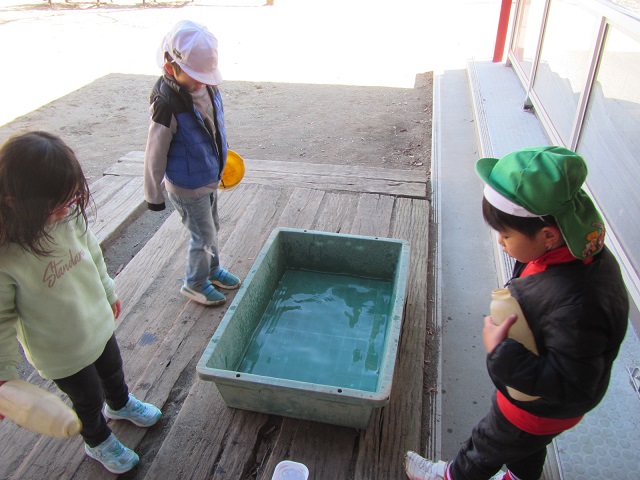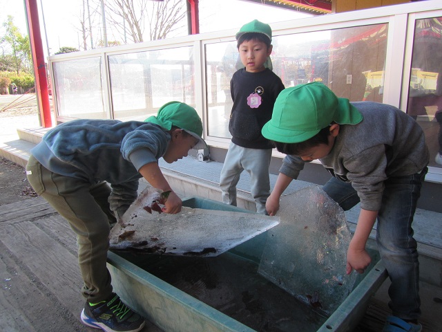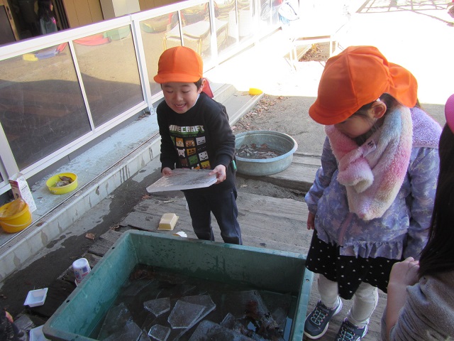 ビオトープで氷を見つけた子どもたちは、自分たちでも氷を作り楽しんでいます。