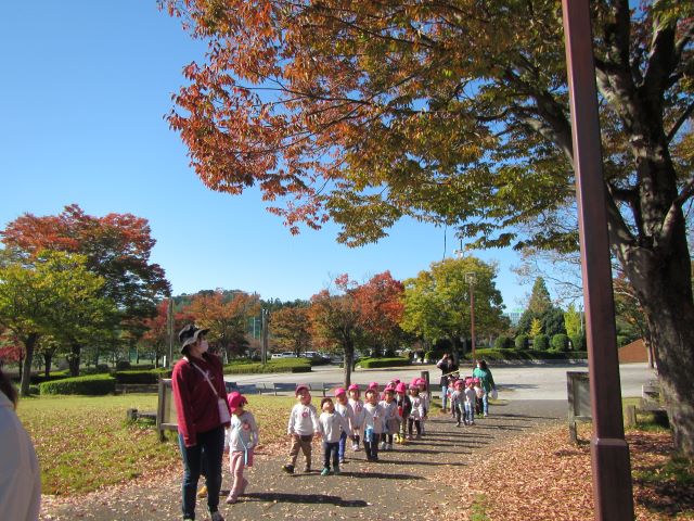 園外保育で運動公園に行きました。少しずつ色づいていく葉に興味津々の子どもたち!