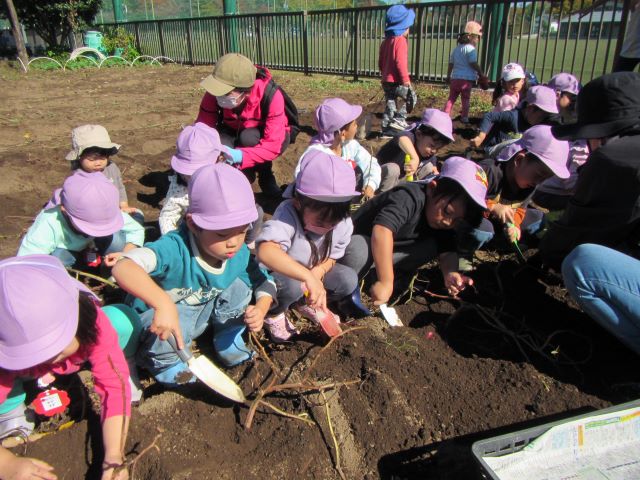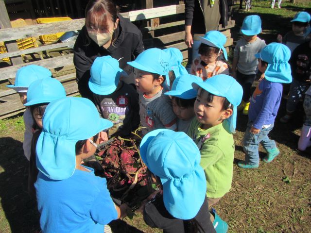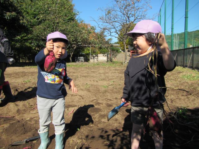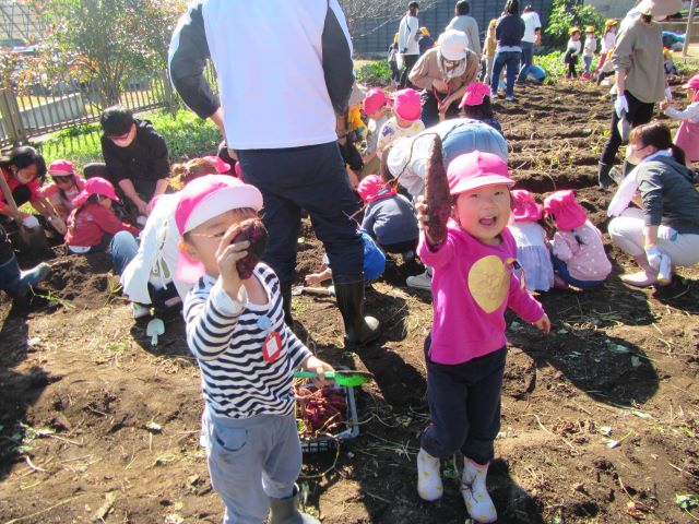 先日、園の畑でさつまいも掘りをしました!さつまいもがとれると大喜びの子どもたち♪