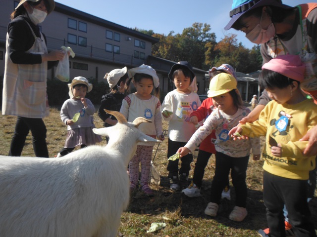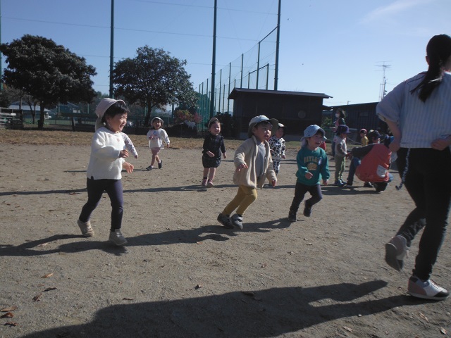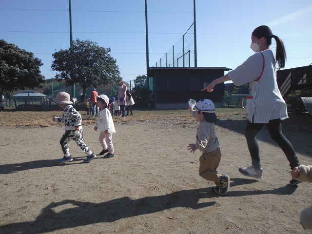 最近の子どもたちは、しっぽ取りに夢中です。しっぽを取られないように必死に走ったり、しっぽのついている保育者や友達を一生懸命追いかけています。秋晴れの気持ちいい戸外で、ゆったりと戸外遊びを楽しんでいます。