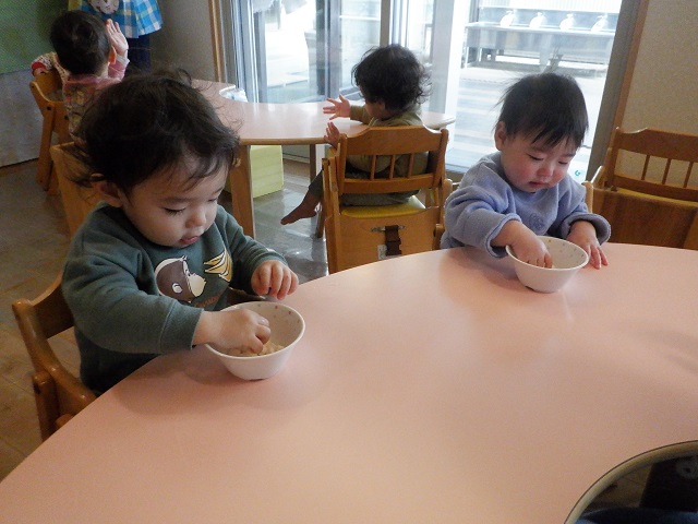 0歳児・・・自分の持ち物が分かるようになってきて、靴箱から靴を取って来たり靴のテープをはがしたりしています。食事面でも手やスプーンを使って自分で食べることが上手になってきました。