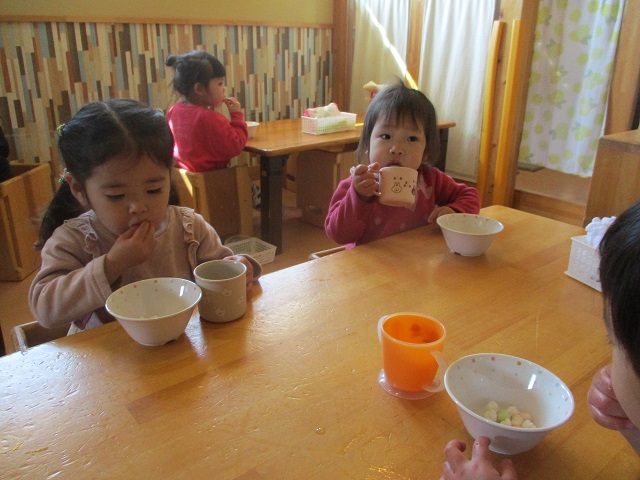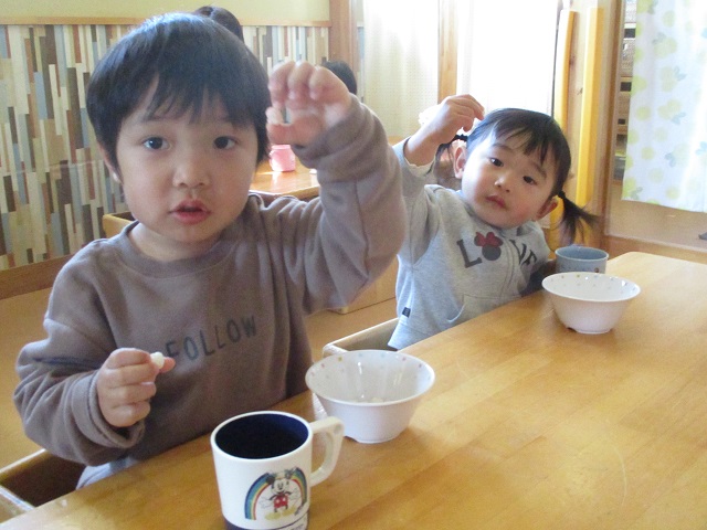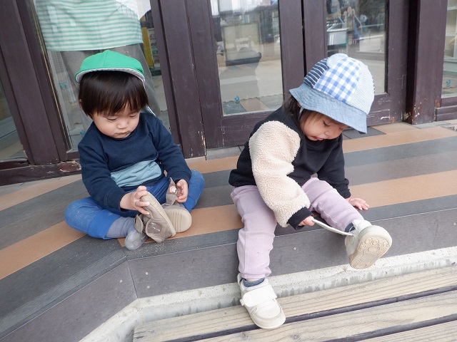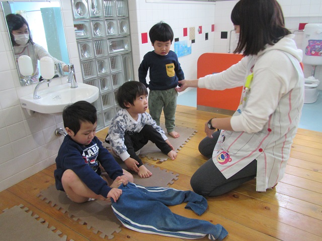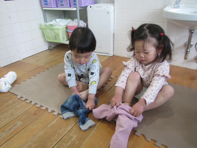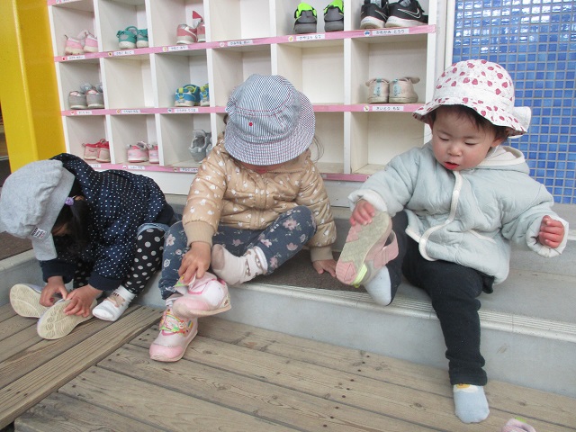1歳児・・・生活面において(靴やズボン等の脱ぎ履き等)、‶自分でやってみたい”という思いがぐんと育ちました。自ら挑戦する姿、ステキです✨