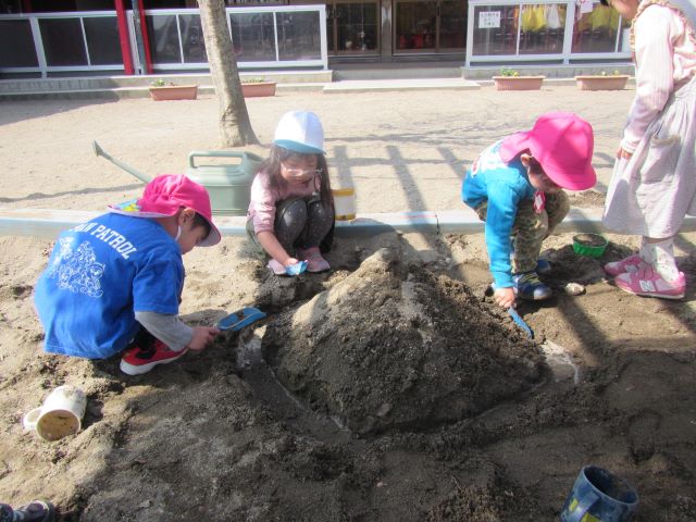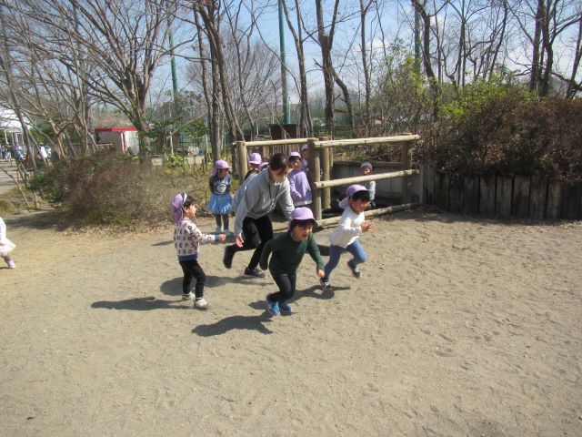日中は暖かく過ごしやすい日が続いていますね。戸外遊びなど色々な友達と一緒に遊びを楽しんでいます!
