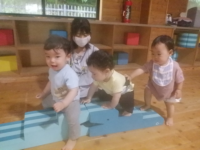 0歳児・・・今週は雨の日が多かったですね。つくし組の子どもたちは保育室でゆったりと過ごしたり、広いホールで体をたくさん動かして遊びました。