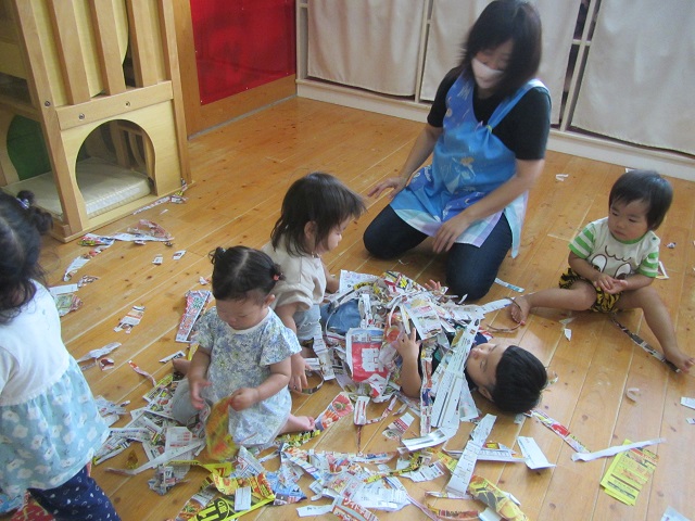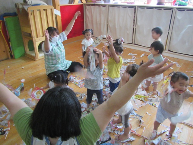 1歳児・・・憂鬱な雨の日でも元気いっぱい!新聞紙あそびで、「3..2..1..それ~っ!」と新聞紙を舞い上がらせて楽しみました♪