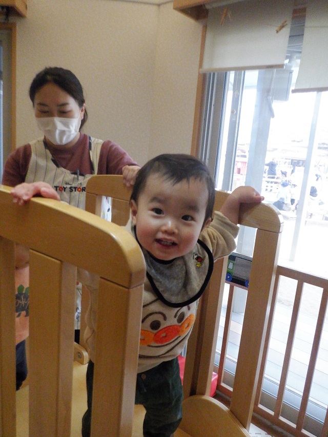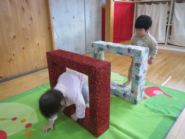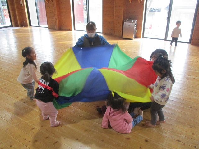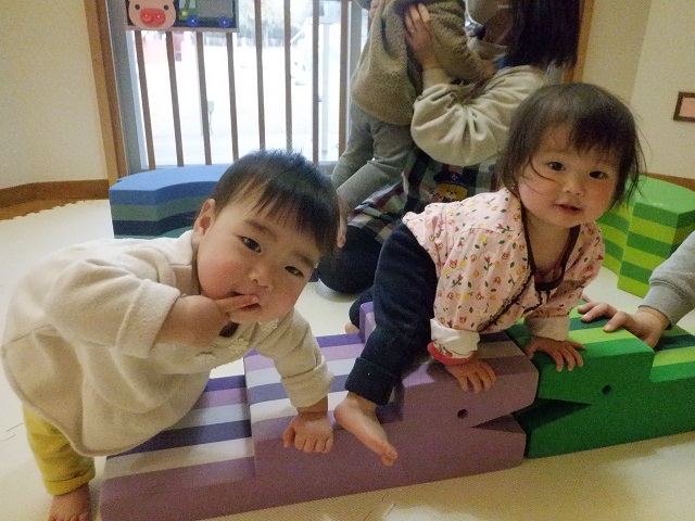1歳児・・・寒い日も元気に部屋やホールで体をたくさん動かしています♪