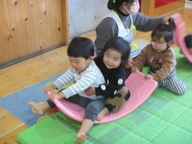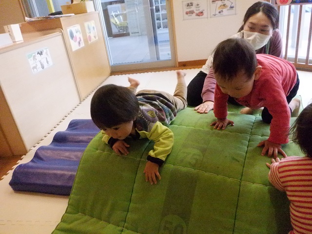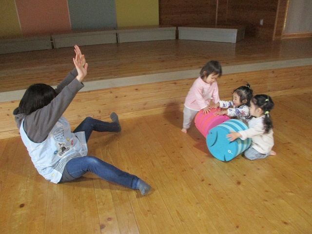 0歳児・・・今週は寒い日が続く一週間でしたね。暖かい部屋の中で伸び伸びと体を動かして遊びました。