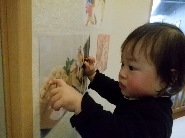 1歳児・・・指先を使ってシールをはがし、台紙に貼ったりクレヨンを握ってなぐり描きを楽しんでいます。