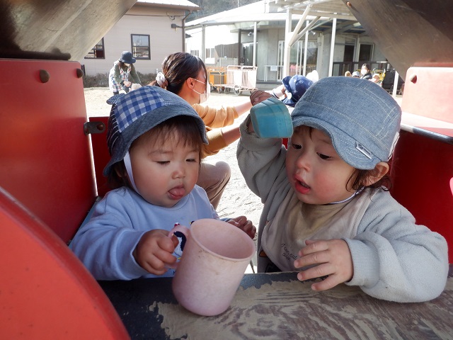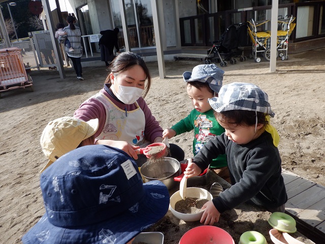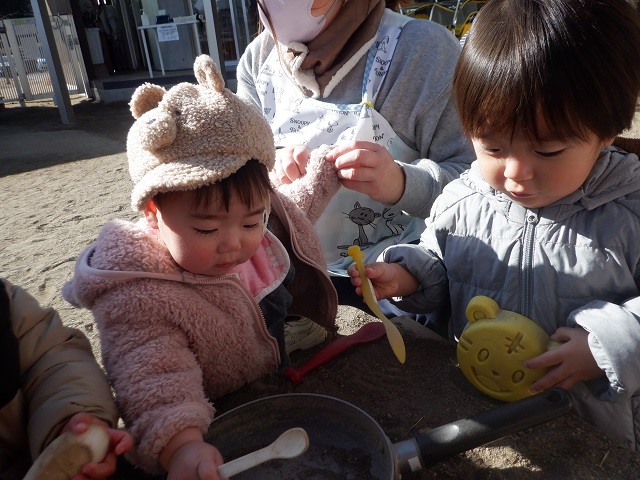 0歳児・・・砂遊びを楽しんでいます。お皿に入れて混ぜたり、食べる真似をすることを楽しんでいます。