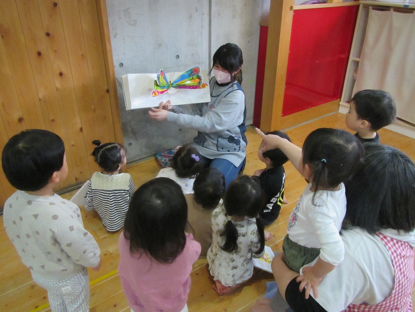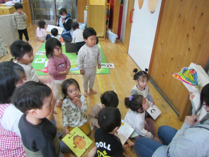 いっぱい遊んだ後は、だいすきなはらぺこあおむしの絵本を見ることを楽しんでいます。
