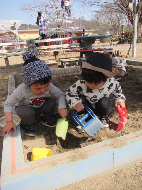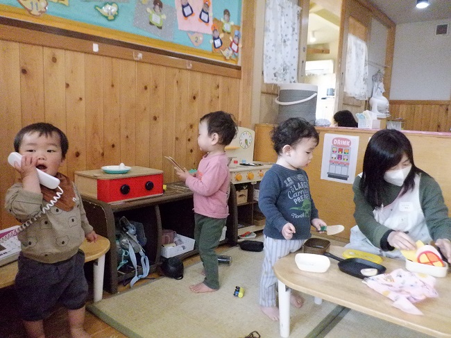 0歳児・・・暖かい日が続いていますね。外に出て温かい日差しを感じたり、進級に向けてはこべ組に遊びに行くことを楽しんでいる子ども達です。