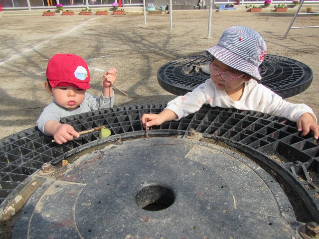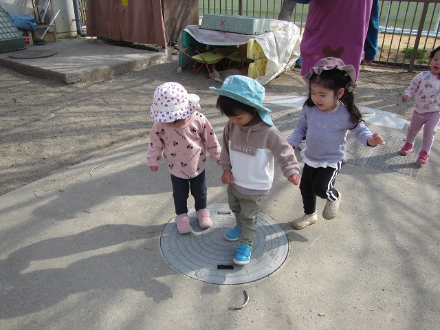 1歳児・・・戸外に出ると、子ども達から「おひさま あったかいねえ」と・・・♪ぽかぽか陽気で気持ちいね♪